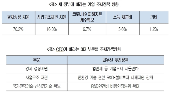 조사결과에 따르면, CEO 10명 중 7명이 ‘경제성장 지원’(70.2%)을 최우선 기업 조세정책으로 응답했고, ‘사업구조재편 지원’(16.3%), ‘코로나19 피해지원을 위한 세수확보’(6.7%) 등이 뒤를 이었다.
