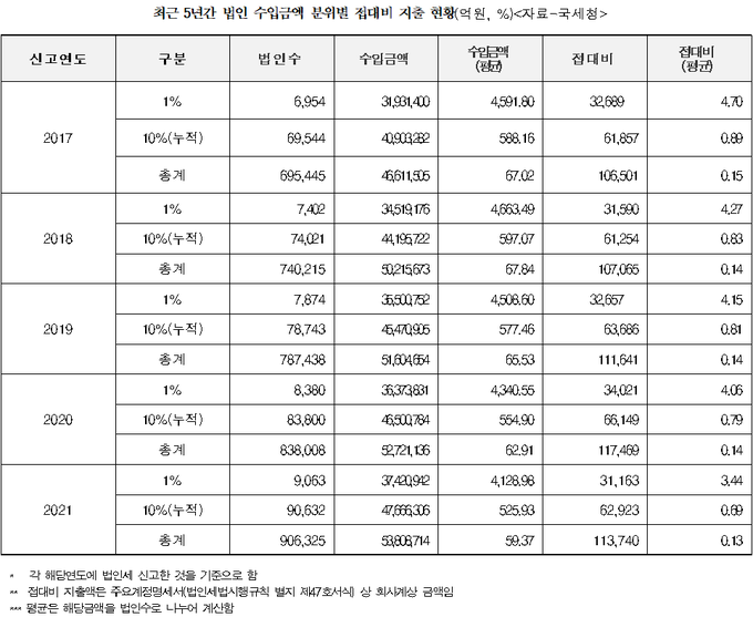 11일 홍성국 의원(더불어민주당)이 국세청으로부터 제출받은 자료에 따르면, 최근 5년(2017~2021년)간 상위 1% 법인의 수입금은 17% 증가한 반면, 접대비는 약 5%, 법인 평균 접대비는 27%가 감소한 것으로 밝혀졌다.