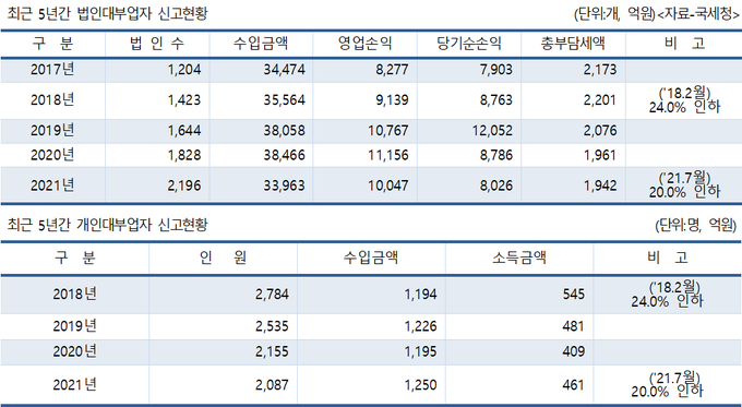 특히 2018년 2월 법정최고금리가 24%로 인하됐음에도 불구하고 법인대부업자는 2019년 수입금액 3조8천58억원, 영업이익 1조767억원, 당기순이익 1조2천52억원을 기록했으며, 2020년에는 수입금액 3조8천466억원, 영업이익 1조1천156억원, 당기순이익 8천786억원을 기록했다.