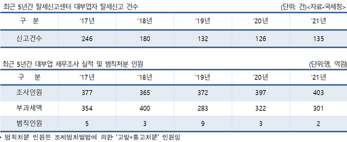이와 관련, 국세청 탈세신고센터에 접수되는 대부업 관련 신고건수는 2017년에 비해 감소했지만 매년 100여건 이상 꾸준히 신고되고 있으며, 작년 한해에만 403명을 조사해 301억원의 세금을 부과하는 등 매년 300억원 이상을 추징하고 있다.