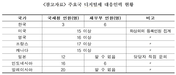 우리나라 디지털세 대응인력이 고작 9명으로, 다른 주요국에 비해 너무 적다는 지적이 나왔다.