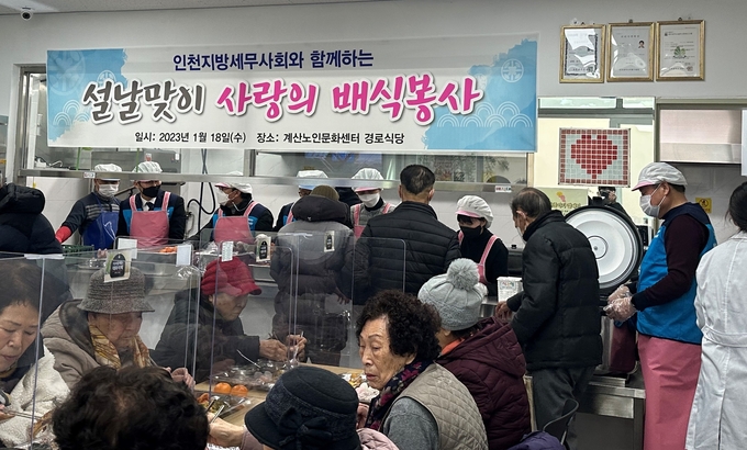 김명진 인천지방세무사회장과 세무사 드림봉사단이 설 명절을 앞둔 18일 인천 계양구에 소재한 계산노인문화센터를 찾았다. 계산노인복지센터를 방문한 독거노인 등을 위해 점심식사 배식, 청소정리 봉사활동을 하고 성금을 전달하기 위해서다.