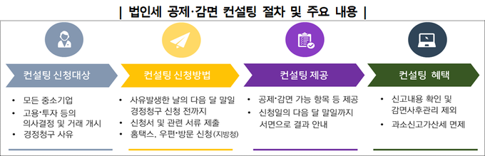 법인세 공제·감면에 어려움을 겪는 중소기업이라면 국세청에서 무료로 제공하는 법인세 공제·감면 컨설팅을 적극 이용할 필요가 있다.