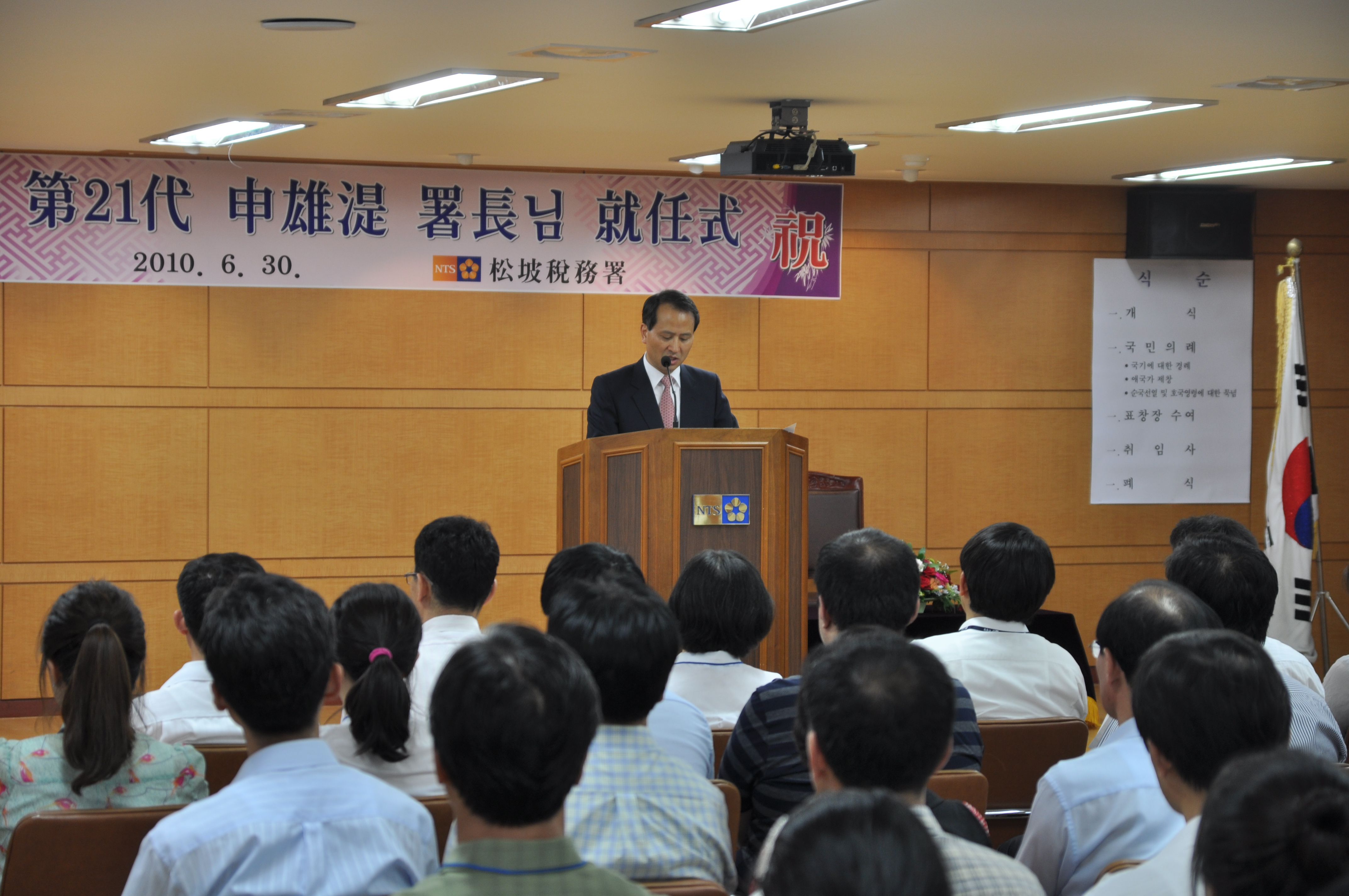 신웅식 서장은 지난달 30일 대강당에서 송파서 전 직원이 참석한 가운데 열린 취임식에서 "송파서에서 뛰어난 역량을 갖춘 여러분과 함께 근무하게 된 것을 매우 기쁘게 생각한다"라며 ▲지역특성에 맞는 세정 집행 ▲선진납세문화 조성 ▲납세자 권익보호 ▲활기차고 즐거운 직장분위기 조성 등을 약속하고 당부했다.<사진>