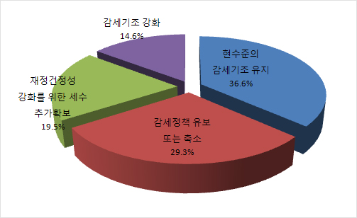 이에 반해 재정건전성 강화 등을 이유로 감세정책을 유보하자는 의견(29.3%)과 증세정책이 필요하다는 의견(19.5%)도 48.8%로 조사돼 조세정책에 대한 전문가들의 견해가 다소 엇갈리고 있는 것으로 나타났다.