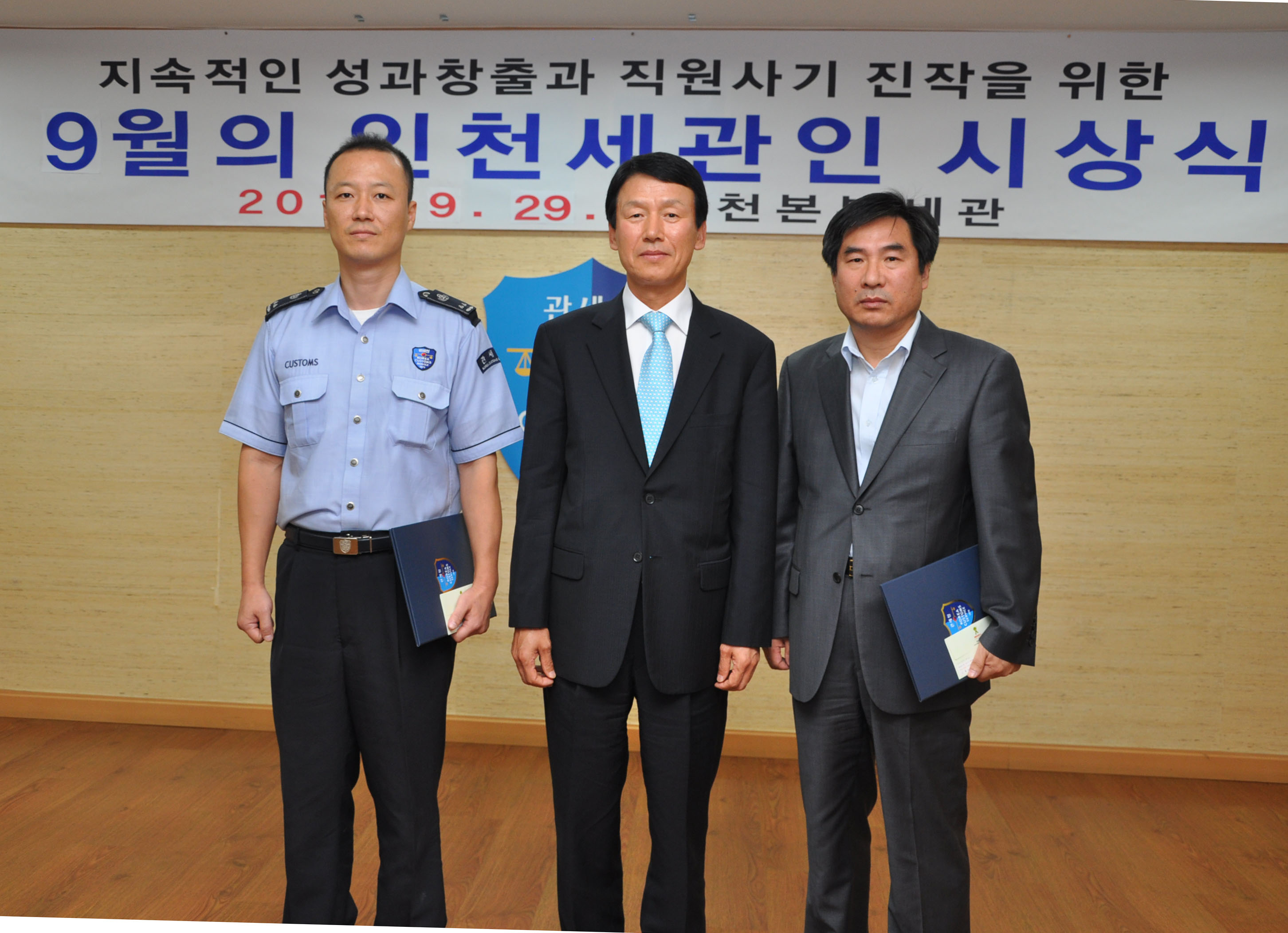 인천세관은 또 '9월의 유공인'으로 관세청 40주년 체육대회에서 역사상 최초로 인천세관을 종합우승으로 이끈 이정보 관세행정관과 FTA 집행센터 조기 정착을 통한 품목별 인증수출자 지정 확대 기반을 마련한 이혜숙 관세행정관을 선정했다.
