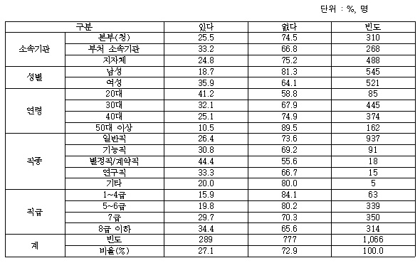공무원 10명 중 3명 정도는 육아와 자녀교육, 자기계발 등을 위해 시간제 근무를 하고 싶어 하는 것으로 조사됐다.