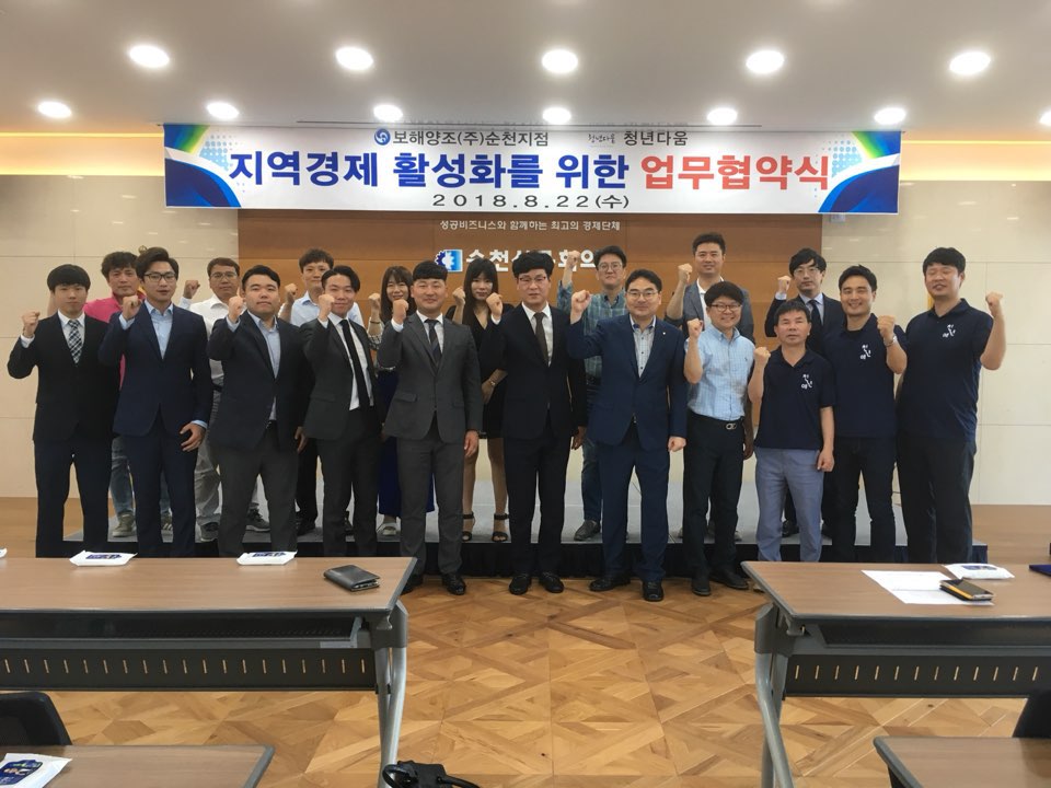 보해양조 순천지점(지점장.김상호)은 지난 22일 순천상공회의소에서 순천지역 청년모임인 청년다움과 업무협약을 맺고 지역경제 활성화에 동참할 것을 다짐했다.