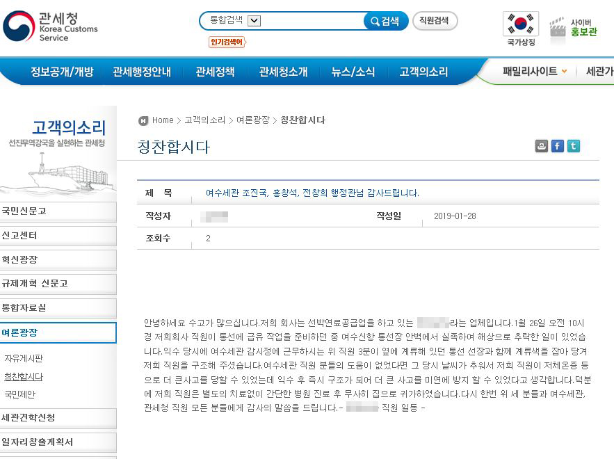 익수자는 세관 직원들의 도움으로 즉시 구조돼 병원으로 이송, 간단한 진료후 무사히 귀가했고, 이를 관세청 홈페이지에 게시해 고마움을 표시했다.