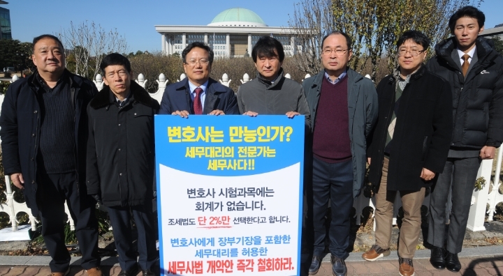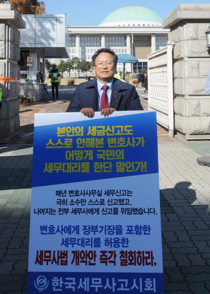 이금주 인천지방세무사회장은 올 가을 들어 가장 추웠던 20일 여의도 국회 앞에서 변호사에게 모든 세무대리업무를 허용하는 내용의 세무사법 개정안 입법저지를 위해 1인 시위에 나섰다.