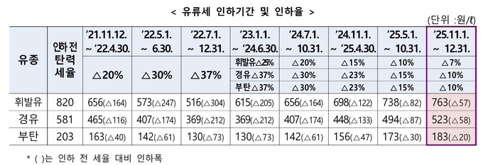 기재부는 유류세 한시적 인하조치 연장에 관한 교통・에너지・환경세법 시행령, 개별소비세법 시행령 개정안을 입법예고하고, 관계부처 협의 및 국무회의 등을 거쳐 11월1일부터 시행할 예정이다.