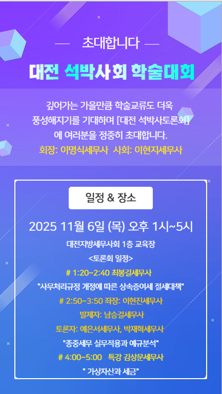 이명식 대전지방세무사석박사회장은 “최근 이슈가 되는 주제의 특강과 실무적인 업무 성과로 이어질 수 있는 토론을 준비했다”며 “귀한 시간이 아깝지 않을 소중한 세무정보들을 얻어 가길 바란다”고 밝혔다.