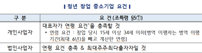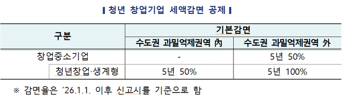 광업·제조업·음식업 등 조특법상 감면대상 업종에 한해 청년 창업기업은 최대 5년간 50~100%까지 소득세·법인세를 감면받을 수 있으며, 국세청은 세액감면 적용 납세자에게 사전 안내문을 제공하는 등 세액감면을 받을 수 있도록 지원하고 있다.