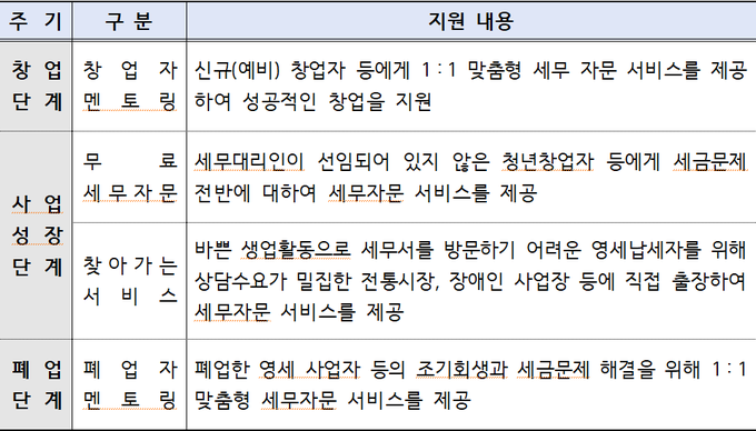 사업 주기별 맞춤형 세무컨설팅도 제공 중으로, 경제적 사정으로 세무대리인을 선임하지 못한 청년창업자 등 영세납세자가 생업에 전념할 수 있도록 나눔세무사·회계사를 배정해 창업단계부터 사업성장·폐업 단계까지 1:1 컨설팅을 제공하고 있다.