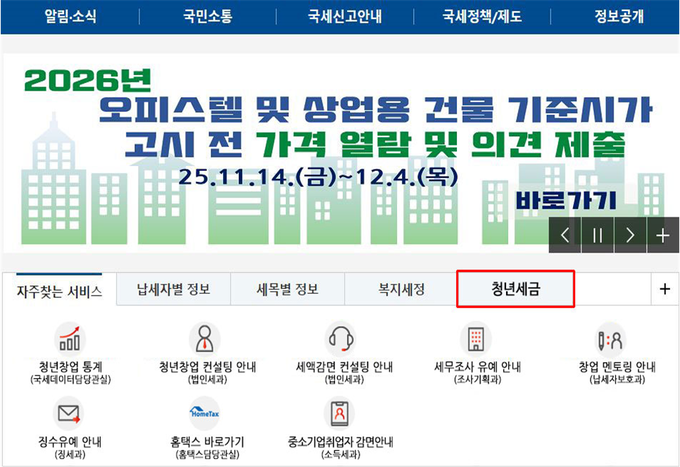 국세청이 올 연말까지 ‘청년세금’ 코너를 누리집에 신설해, 분야별로 산재해 있는 창업 관련 법령과 감면제도 등을 하나의 창구에서 쉽게 볼 수 있도록 지원한다.