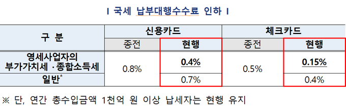 또한 납세자·세목 구분 없이 적용되는 현행 납부대행수수료율을 각 0.1%p 일괄 인하한 데 이어, 영세사업자의 사업과 밀접한 부가세·종소세에 대해서는 신용카드 기준 50%(0.8%→0.4%) 인하된 수수료율을 적용하고 있다.
