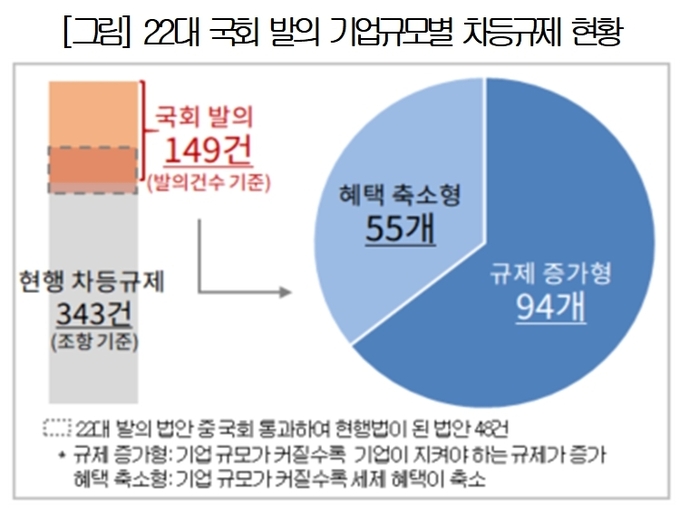 현행 12개 법률상 기업 규모별 차등규제가 343건이나 존재하는 상황에서 22대 국회 출범 19개월 만에 다량의 규모별 차등규제가 발의된 것이다.