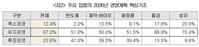 기업들의 신중한 경기전망은 올해 경영계획에도 반영됐다. 2026년 경영계획 핵심기조를 묻는 질문에 기업 79.4%가 ‘유지경영’ 또는 ‘축소경영’으로 답했다. 이중 ‘유지경영’을 선택한 기업 비중이 67%에 달해 ‘확장경영’을 택한 기업(20.6%)보다 3배 이상 많았다.
