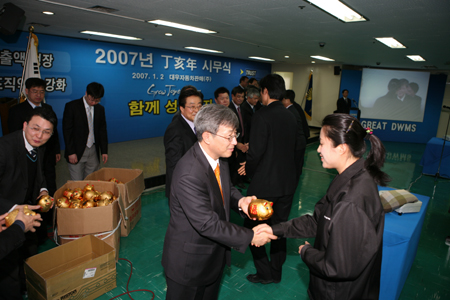 한편 대우차 판매는 이날 인터넷 시무식을 통해 2007년 한 해 동안 직원 개인은 물론, 가정과 회사가 다함께 성장하자라는 의미로 황금돼지 저금통을 제작해 이동호 사장이 전 직원들에게 격려하며 선물했다.
