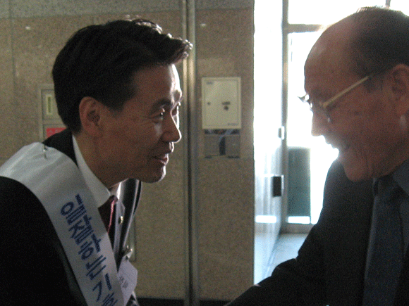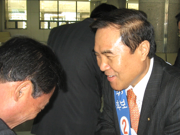 [기호 2번 조용근 후보가 유권자에게 지지를 부탁하고 있다]