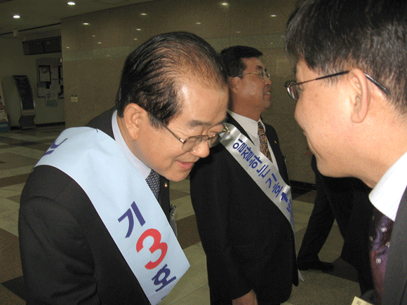 [기호 3번 정은선 후보가 유권자에게 지지를 부탁하고 있다]