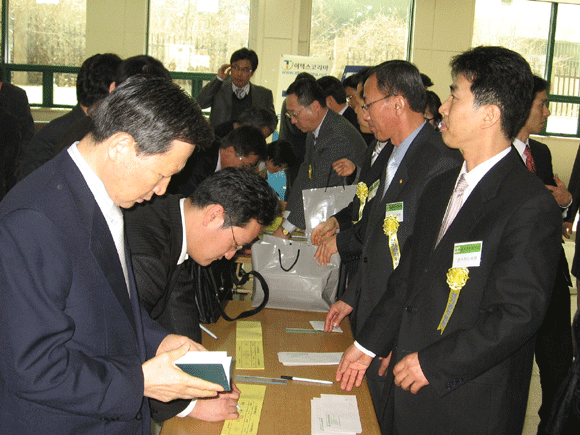 [투표장에 도착한 회원들이 신원확인 사인을 하고 있다]