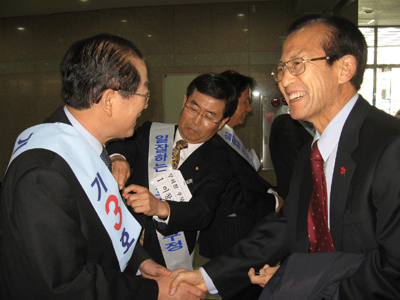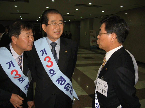[정구정 회장후보의 러닝메이트 이창규 부회장후보가(중앙) 정은선 회장후보 진영에 다가와 정은선 후보(왼쪽)의 명찰을 매만져 주고 있다.]
