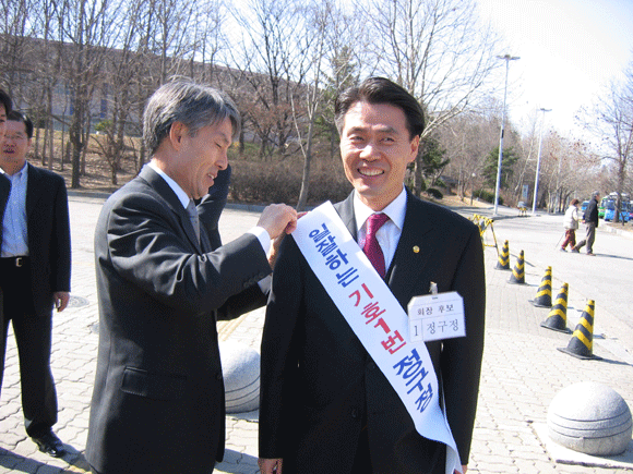 [기호 1번 정구정 후보. 김종화 회원이 정후보의 어깨띠를 매만져주고 있다]