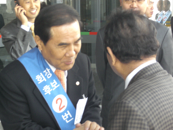 [기호 2번 조용근 후보. 한 회원과 악수를 나누면서 지지를 부탁하고 있다]