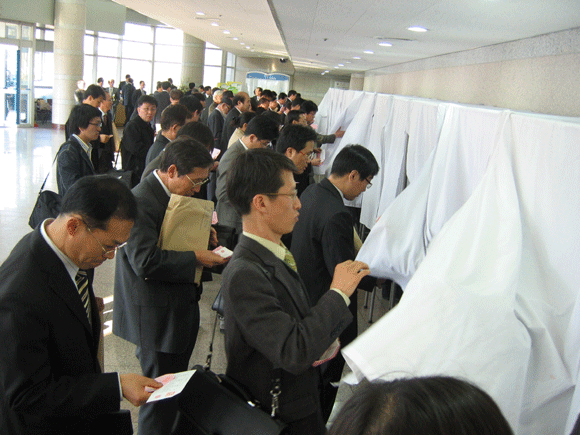 회원들이 기표소 입구에서 역시 차례를 기다리고 있다.