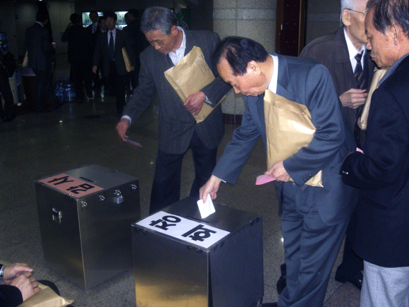 기표를 마친 회원들이 투표용지를 투표함에 넣고 있다.