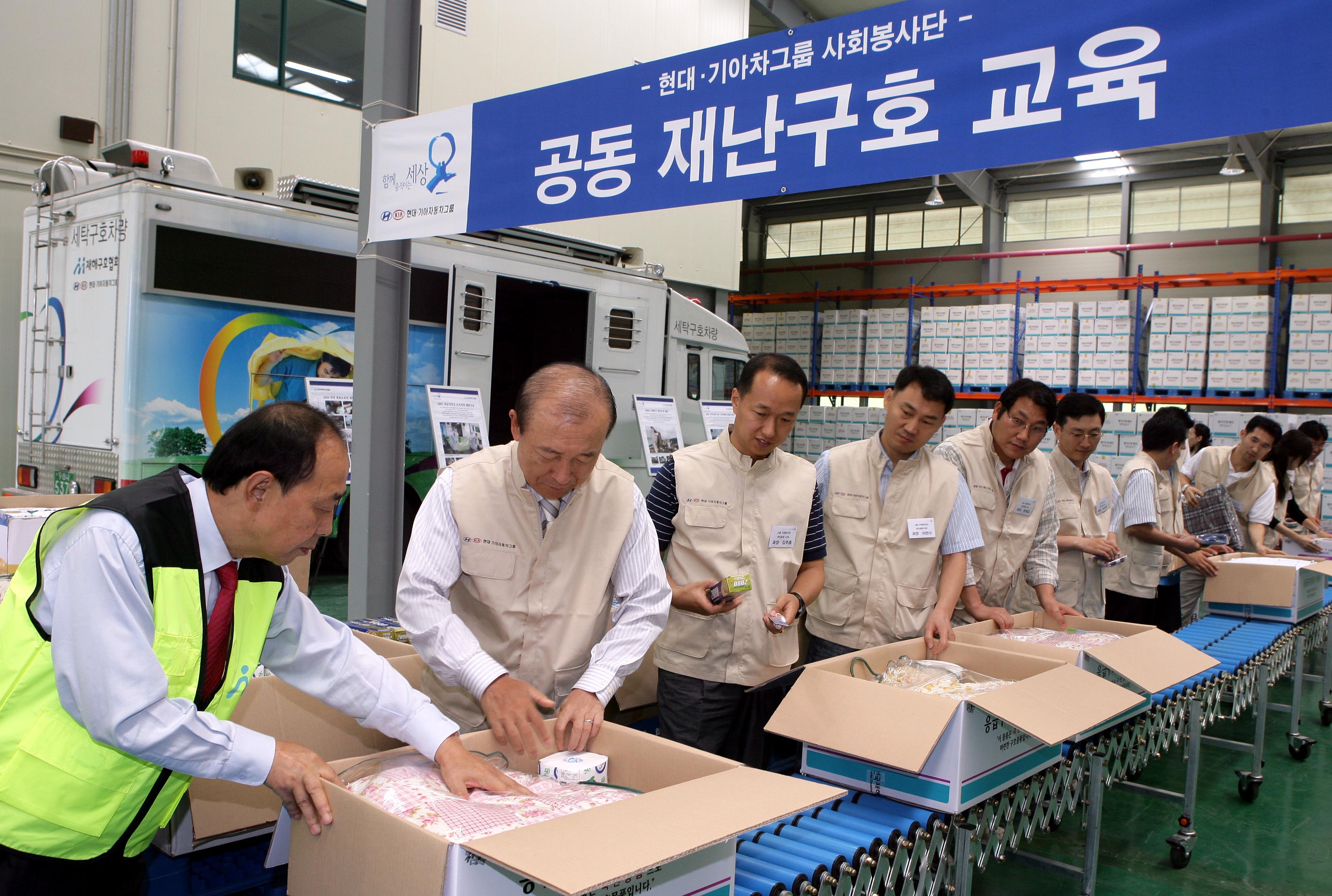 현대ㆍ기아차그룹(회장 鄭夢九)은 5일 그룹 사회봉사단을 소집해 전국재해구호협회 파주교육장에서 심폐소생술과 세탁구호차량 이용 등의 재난극복 교육을 실시하고 재난 지역에 투입될 구호물품을 사전 준비하는 등 올 여름 재해에 대비한 전 그룹 차원의 구호 활동 준비를 완료했다고 밝혔다.