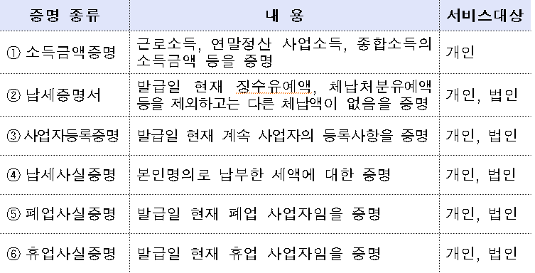 발급증명서는 소득금액증명, 납세증명서, 사업자등록증명, 납세사실증명, 폐업사실증명, 휴업사실증명 등 6종으로, 그간 '민원24'에서는 열람만 가능했으나 국세청과 행자부간 협업을 통해 망간 실시간 연계시스템을 구축함으로써 국세증명 발급서비스를 제공할수 있게 됐다.