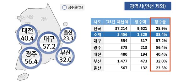 총 체납액의 9.3%를 차지하는 5개 광역시는 전국 평균 징수율을 웃도는 38.4%이고, 대구는 체납 징수율이 무려 57.2%에 달했으며, 광주와 대전도 각각 56.4%, 40.4%로 높은 징수율을 보였다.