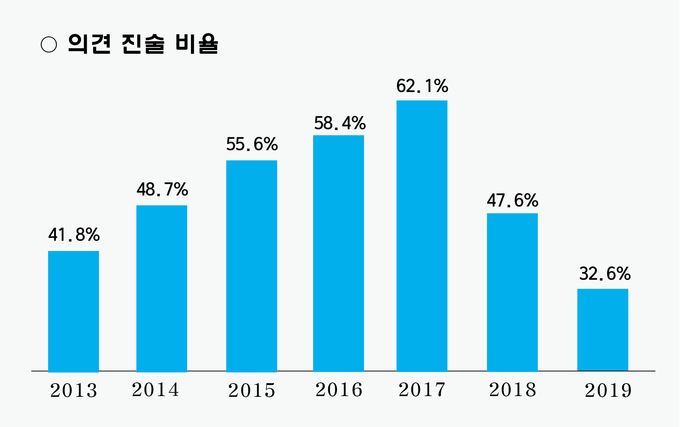 전체 처리사건 대비 의견진술 비율은 심판통계에 기록된 2010년 34.2%를 시작으로 매년 가파르게 오르다 2017년 62.1%로 최대치를 기록한 이후 2018년 47.6%, 2019년 32.6%로 지속 하락했다.