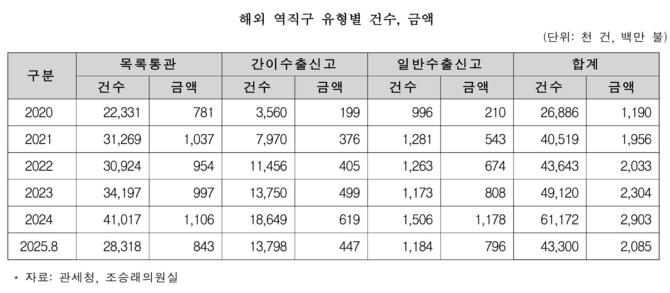 최근 5년간 직구 6억8천447만건 중 4억9천609만건(72.5%)이 목록통관 반입으로 나타났다. 대다수 직구 물품이 미화 150달러(미국산은 200달러) 이하의 소액·비상업용 물품인 것. 역직구 역시 같은 기간 총 2억6천464만건 중 71%인 1억8천805만건이 목록통관 반출 건에 해당한다.