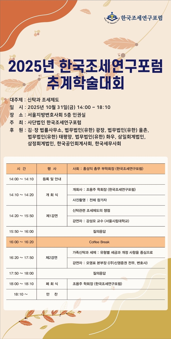 한국조세연구포럼(학회장·조용주)는 오는 31일 서울지방변호사회 5층 인권실에서 '신탁과 조세제도'를 주제로 추계학술대회를 개최한다.