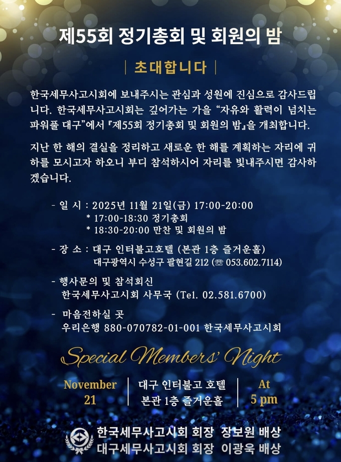 한국세무사고시회(회장·장보원)는 내달 21일 대구 수성구 인터불고호텔 본관 1층 즐거운홀에서 ‘55회 정기총회 및 회원의 밤’을 개최한다고 22일 밝혔다.