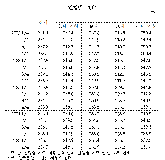 올해 2분기들어 모든 연령대에서 소득 대비 부채(LTI)가 늘어난 가운데, 30대 이하 계층의 부채비율이 전 분기 대비 가장 많이 오른 것으로 나타났다.