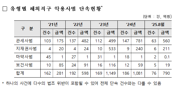 유형별로는 관세사범이 562건, 2천497억원으로 적발건수와 규모 모두 가장 많았다. 지재권사범은 33건에 불과했지만 적발규모는 1천28억원에 달했다. 이밖에 보건사범 67건(370억원), 마약사범 123건(4억1천만원)으로 나타났다.