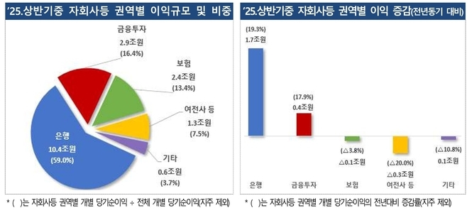 전년 동기 대비 이익 증감은 은행이 1조6천898억원(19.3%), 금융투자가 4천390억원(17.9%) 증가한 반면, 보험 932억원(-3.8%), 여전사 등은 3천343억원(-20.0%) 감소했다.