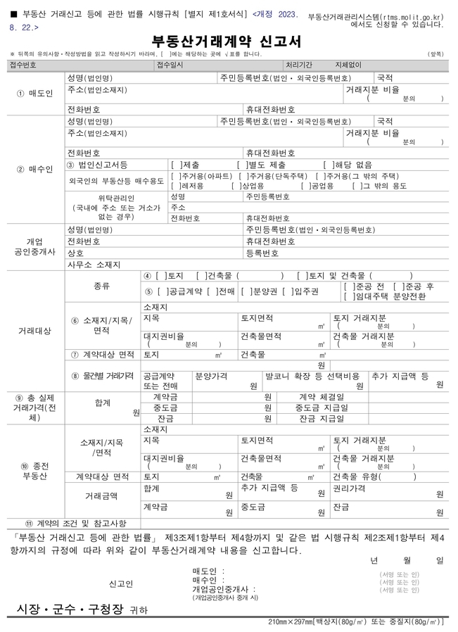 가. 거래당사자의 인적사항 나. 계약 체결일, 중도금 지급일 및 잔금 지급일 다. 거래대상 부동산등(부동산을 취득할 수 있는 권리에 관한 계약의 경우에는 그 권리의 대상인 부동산을 말한다)의 소재지ㆍ지번ㆍ지목 및 면적 라. 거래대상 부동산등의 종류(부동산을 취득할 수 있는 권리에 관한 계약의 경우에는 그 권리의 종류를 말한다) 마. 실제 거래가격 바. 계약의 조건이나 기한이 있는 경우에는 그 조건 또는 기한 사. 매수인이 국내에 주소 또는 거소(잔금 지급일부터 60일을 초과하여 거주하는 장소를 말한다)를 두지 않을 경우(매수인이 외국인인 경우로서 「출입국관리법」 제31조에 따른 외국인등록을 하거나 「재외동포의 출입국과 법적 지위에 관한 법률」 제6조에 따른 국내거소신고를 한 경우에는 그 체류기간 만료일이 잔금 지급일부터 60일 이내인 경우를 포함한다)에는 위탁관리인의 인적사항 아. 개업공인중개사가 거래계약서를 작성ㆍ교부한 경우에는 다음의 사항 1) 개업공인중개사의 인적사항 2) 개업공인중개사가 「공인중개사법」 제9조에 따라 개설등록한 중개사무소의 상호ㆍ전화번호 및 소재지 |