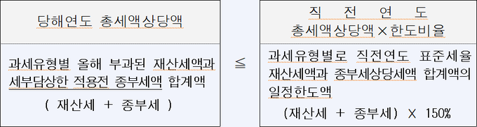 세부담상한은 과세유형별(주택·종합합산토지·별도합산토지)로 구분해 각각 150%를 한도로 적용한다. 또한, 과세유형별로 올해 부과된 재산세와 세부담상한 적용 전 종합부동산세 합계액이 직전연도 표준세율 재산세액 및 세부담상한 적용 전 종합부동산세 상당세액 합계액의 150%를 초과하는 경우 그 초과된 세액은 “0”으로 본다.