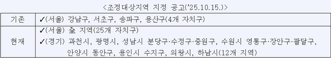 서울시 서초구·강남구·송파구·용산구가 ’25년 과세기준일(6.1.) 기준 조정대상지역에 해당하므로, ’25.10.15. 주택시장 안정화 대책 때 새로 지정된 조정대상지역은 올해 부과되는 종합부동산세에 영향을 미치지 않는다. 다만, 이번에 새로 지정된 조정대상지역 공고일의 다음날부터 새로 취득하거나 등록신청하는 민간매입임대주택은 내년에 합산배제 대상에서 제외될 수 있다.