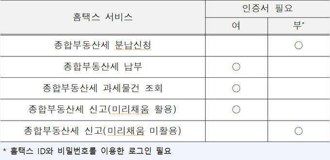 ◆홈택스의 종합부동산세 관련 서비스 중 인증서가 필요한 것은?