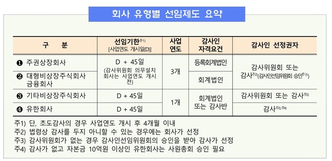 감사인 선정권자도 유형별로 다르다. 감사위원회 설치회사는 감사위원회가 감사인을 선정한다. 감사위원회가 설치되지 않은 주권상장회사·대형비상장회사·금융회사는 감선위의 승인을 받아 감사가 선정하고, 법령상 감사를 두지 않아도 되는 경우 회사가 선정한다.