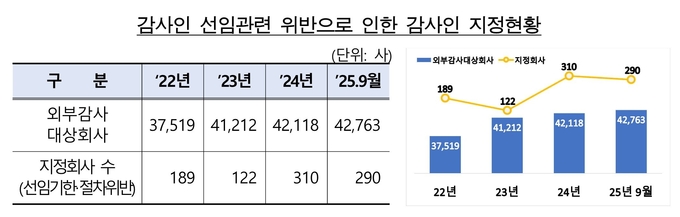 외부감사대상 회사는 2022년 3만7천519곳에서 2023년 4만1천212곳, 2024년 4만2천118곳, 올해 9월 4만2천763곳으로 지속 증가세다. 올해는 9월까지 290곳이 감사인 선임기한·절차를 위반해 감사인 지정된 것으로 나타났다. 이는 지난해 310곳 대비 소폭 감소했으나, 2023년 122곳에 비해서는 많다.