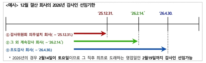 다만 감사위원회 의무설치 회사는 사업연도 개시일 이전까지 선임해야 한다. 상법상 자산 2조원 이상 상장회사 또는 금융회사의지배구조에관한법률에 따른 금융회사(법 제3조제3항의 회사는 제외)가 대상이다.