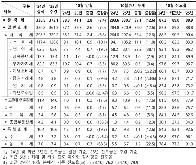 기획재정부가 28일 발표한 ‘2025년 10월 국세수입 현황’에 따르면, 2025년 10월 누계 국세수입은 330조7천억원으로 집계됐다. 이는 전년 동기 대비 37조1천억원 증가한 규모다. 진도율은 88.9%로 최근 5년 평균과 유사한 수준을 보였다.