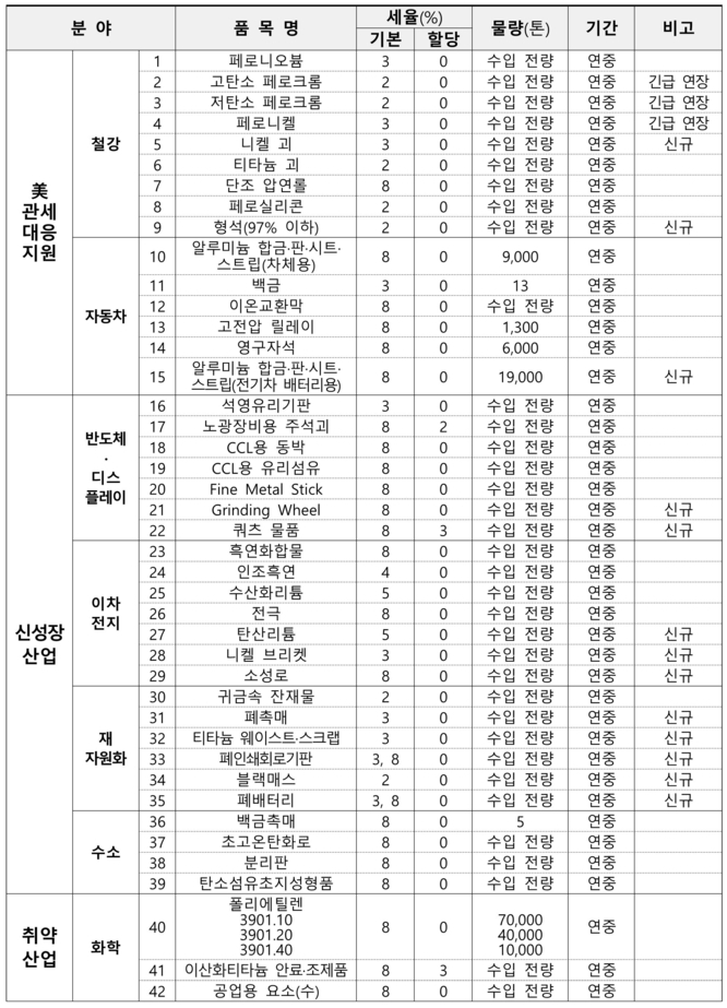 핵심광물 공급망 안정을 위해 폐촉매, 폐인쇄회로기판, 폐배터리 등 재자원화 원료 5개에 대해 할당관세가 신규로 적용된다. 또한 농축어업, 섬유 등 취약 산업 지원을 위해 사료·비료·농약·섬유 원재료 등도 올해와 마찬가지로 할당관세를 적용한다.
